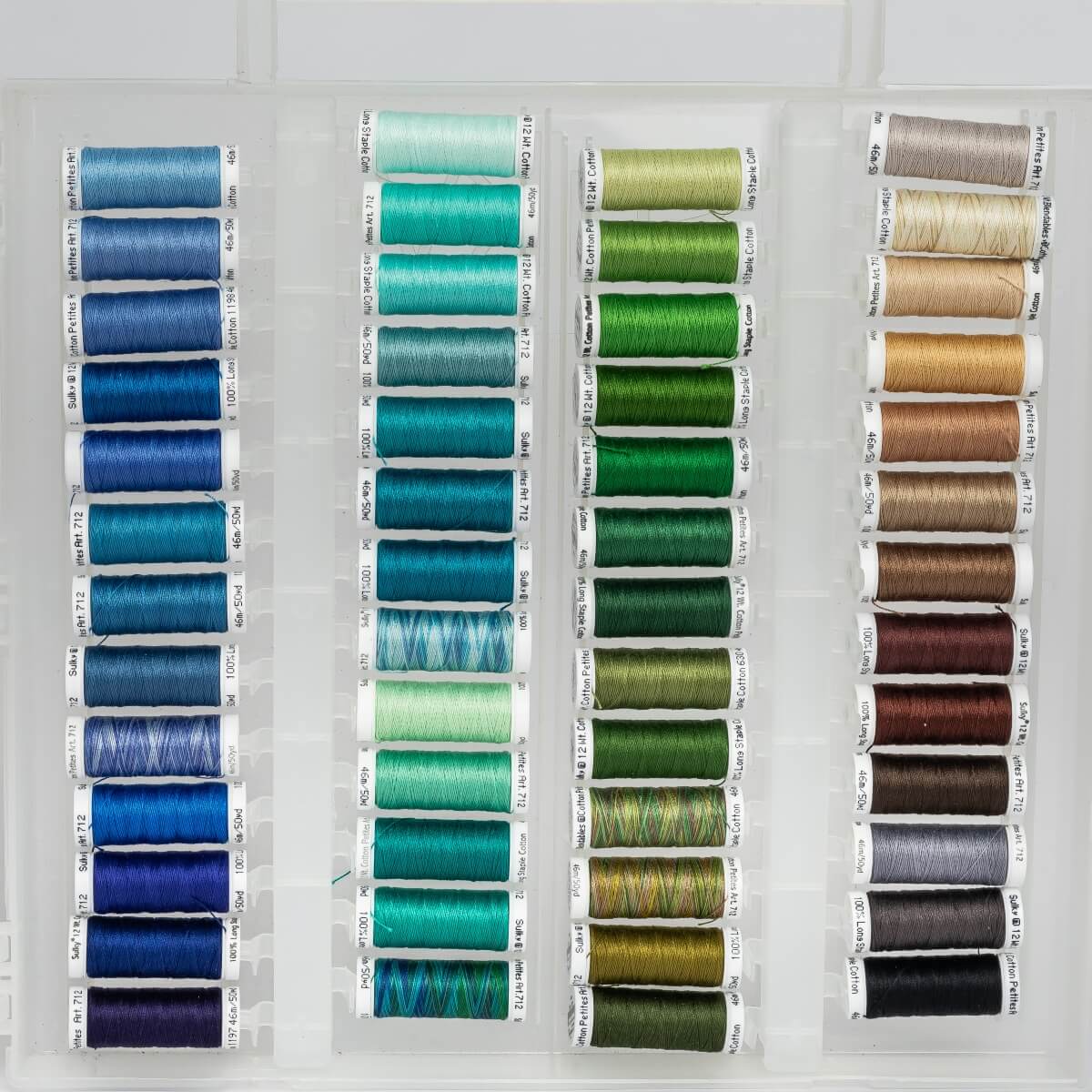 Die 104 beliebtesten SULKY® COTTON PETITES 12 Farben, auf einen flexiblen Dorn aufgesteckt, leicht herausnehmbar und trotzdem gut und geschützt aufgeräumt.